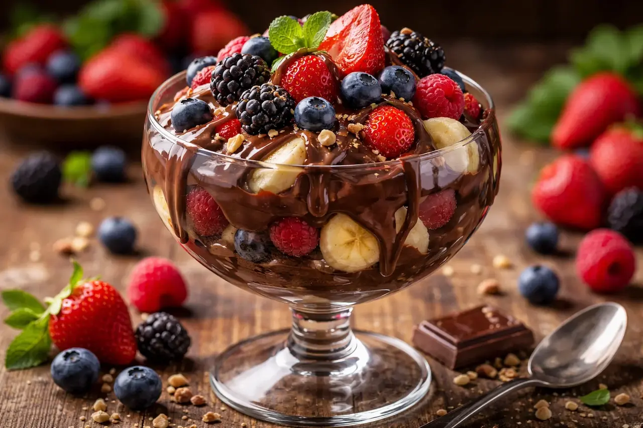 Uma sobremesa sofisticada e deliciosa, com camadas de brigadeiro cremoso, frutas frescas e uma cobertura irresistível de chocolate.